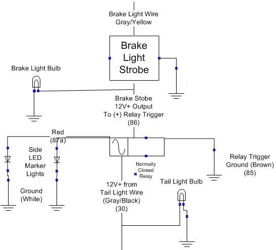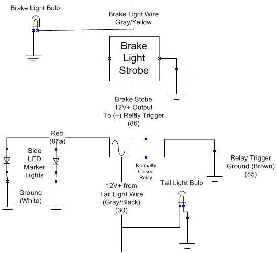 The lights I install in the outer sections of the tail light lens are described here. Once that's been done, there are two ways to skin this cat. 1) Only Outer LEDs Strobe: This is the easiest approach and gives you improved tail lighting, keeps the BMU happy and the outer LEDs strobe when you apply the brakes. Here's how to wire it up with a three wire strobe controller: