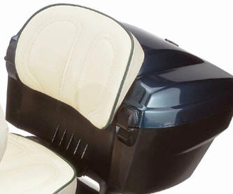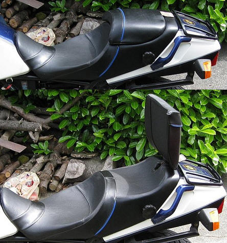 Once you have the seat positioned well tighten up all of the hardware. Then install the latching post, align it and tighten it down. Weight: Corbin seats have a thick fiberglass seat pan and therefore are pretty heavy compared to other seats. Recovering: Upholstery shops tend to charge a lot to recover Corbin seats. One reason for this is that Corbin uses rivets instead of staples to attach the seat cover. It takes more labor to drill out all of those rivets so they charge more. Some shops might give you a break on the price if you drill them out yourself ahead of time. Seat Hardness: The foam Corbin uses is pretty firm so when you first sit on the seat it might not seem that comfortable. Corbin does this on purpose because although a cushy seat might feel great when you first sit on it a moderately firm foam provides better overall comfort if you are sitting on it for a long time. If you have a new seat then it may take a bit of riding until the seat gets broken in. A good way to make a Corbin seat more comfortable for long rides is to use a sheepskin seat pad. One of the more popular sources for them is Alaska Leather. Rider Height: The off the shelf Corbin seats are made for an average sized rider (whatever that is) and generally work well for most riders. However, Corbin does build custom seats for taller and shorter riders. I've had Corbin seats where the distance from the tip of the seat to the top back of the rider portion varied from 14.5" to 18". Backrests: Depending upon the model of seat Corbin seats can come with mounting for either rider or passenger Corbin backrests. For the K1100LT Corbin makes a nice top case backrest that's better than the rubber factory one.