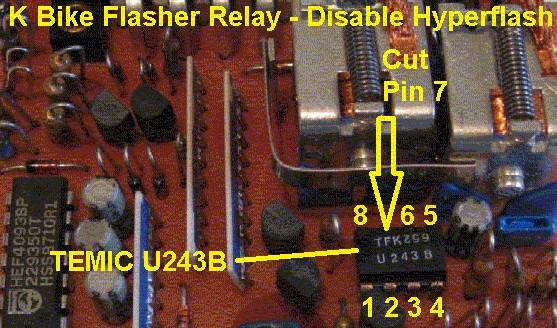 Alternatively, you could flip the flasher relay over and cut the trace that goes to Pin 7. Long version: The 8-pin U243B and U2043B chips made by TEMIC are "Warning or Car-Direction Indicator" chips. This is the chip in your flasher relay that controls the hyperflash feature. Cutting Pin 7 disables the hyperflash so that it will not be triggered by the use of LED turn signal bulbs.
