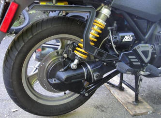 This is a K75 that I converted to a paralever final drive. Why? Mono vs. Para - Due to the geometry and physics involved, under acceleration a monolever produces what is commonly referred to as the "jacking effect." This causes the monolever swing arm to rotate downwards and lift up the rear of the bike. The harder you accelerate, the more jacking effect you'll experience.