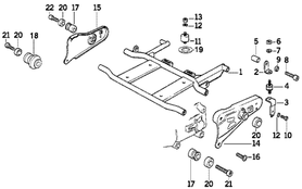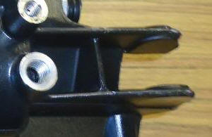 Bottom right rear of a later K75/K100 transmission. (Upside down) Transmission: Option B - Some of the later K75/K100 transmissions do have the mounting tangs for the front end of the paralever strut. However, they do not have holes in them so they would need to be drilled/machined to accommodate the bolt at the front of the paralever strut. Swing Arm - You'll need a 4V K bike swing arm and the rubber boot (with hose clamps) that connects it to the paralever final drive. The pivot hardware at the front of the swing arm is the same for monolever and paralever swing arms so you can re-use those. You will need to have the right and left pivot hardware where the paralever swing arm connects to the final drive. Drive Shaft - You'll need both halves of the paralever drive shaft. Be sure the U-joints aren't "lumpy." The U-joints on the paralever drive shaft are the common point of failure but given the lower horsepower of a K75 that should be less of an issue. Paralever Strut - There are two styles of these. Early solid ones and later two piece stamped metal versions. I prefer the latter since they're a bit lighter. Shock - The shock for paralever bikes is about an inch longer so you'll need one of those too. Peg Plates: Option A - The "bulge" where the swing arm meets the paralever final drive will not fit inside of a K75/K100 right peg plate. However, you can shim out the rear of the right peg plate with some washers to deal with that. Peg Plates: Option B - Use peg plates from a K100RS4V or K1100. (The picture at the top of the page has K1100 peg plates.) These are already stepped out in the back to accommodate the paralever bulge. Since the left side is also stepped out, you'll need some longer bolts and spacers for the exhaust hanger bracket.