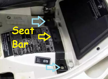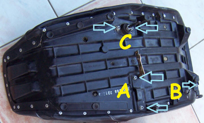 A - Front hinge B - Rear hinge C - Locking post The rear hinge attaches to the seat bar. The seat bar is held down by two hex head bolts:
