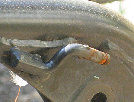 When installing a "new" seat, loosen the seat bar bolts so that the seat bar can move around slightly. Leave the seat post off of the seat for now and install the front and rear hinges with their mounting bolts slightly loose as well. Front hinge post on right side of frame: