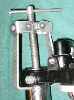 © 2013 Drake Smith - Please do not use or reproduce this elsewhere. Feel free to link to it though. Installing Progressive Springs In Showa Forks 1992 and later K75s came with Showa forks that are better than the two earlier types of forks that BMW used prior to 1992. I decided to swap some Showas in on one of my K75s to replace the earlier S forks. Although the Showa forks came from the factory with progressive springs, I decided to upgrade the forks with stiffer springs from Progressive suspension. Part number 11-1509 for the Showa forks. (11-1126 for earlier K75 forks.) (Since the Showa forks are 0.3 mm smaller in diameter I also swapped in some later fork trees as well.) Note: It's a good idea to work on forks one at a time so you don't get the parts confused. Before disassembling them, I drained them and measured how much fork oil came out. It was a little over 400 ccs. (Which is close to the 410 cc BMW spec for refilling them after draining them - or 420 cc if you disassemble them.) With the fork mounted in the upper fork tree, I depressed the fork cap with a wheel puller in order to pick out the C clip that holds the cap in the stanchion.