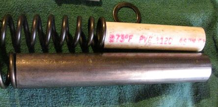 Since the Progressive springs take up more volume in the fork, the forks need less oil. I refilled the fork with 410 ccs of fork oil and used a piece of wooden dowel to measure the distance from the top of the stanchion to the top of the fork oil with the factory spring still installed. The oil level was just under 11" below the top of the stanchion with the fork fully extended. This is how much oil I put in once I installed the Progressive springs. The length of the spacer that came with the new springs was 4 5/16". When I laid the factory factory spring and spacer next to the new spring and spacer they were just about identical in length so I decided just to install the new spacer as is and not trim it. This will probably give more a bit more preload than original but I can always go back and trim it later if the front end feels too stiff.