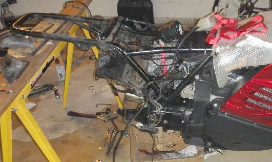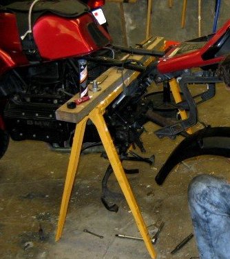 In the attached write-up, in order to avoid having to disconnect and then refill the ABS II control unit, I removed the tail cowl and placed a sawhorse under the rear of the frame. For ABS I or non-ABS bikes, you can just remove the Motronic, ABS I control unit and battery and run a sawhorse through the middle of the frame.