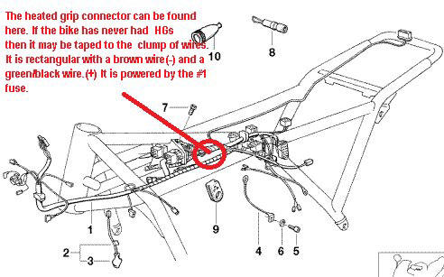 When you take the box apart you'll find that the potentiometer under the knob is separate from the PWM printed circuit board. What I did was lengthen those wires so that I could install the potentiometer and knob in the dash pad and hid the rest of it in the fairing. I also coated the potentiometer in five minute epoxy to waterproof it. I installed a 3mm 12V LED, wired to the output, right above the control knob for visual verification that the heated grips are getting power and to make it easier to find the knob at night. BMW OEM Heated Grips: The factory main wiring harness for K bikes has a connector for heated grips. It is a "T" connector which has short leads and can be found under the tank on the left side about two thirds of the way back. It has two wires. The green/black wire is switched power from Fuse 1. The brown wire is a ground. Use the green/black wire as the positive input and the black wires from the old white connector as the positive output to the heated grips.