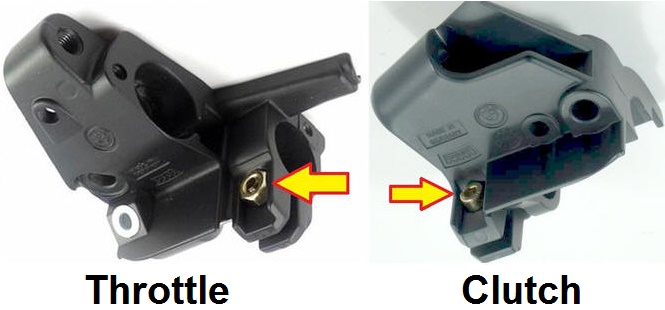 Clutch perch: The clutch perch adjusts the same as for the K75/K100 as pictured above. Throttle perch: The left combination switch assembly needs to be removed first. It is held on by a Phillips screw. Since the threads of that screw may be corroded be sure to use a good screwdriver with a fair amount of direct pressure to initially break the threads free.
