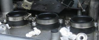 After I replaced the vacuum caps with OEM ones I took a look at the intake manifolds under the TBs and noticed they were cracked - not surprising for a bike of this age and miles. The first step was to use a Dremel cutting wheel to get rid of the stupid Oetiker clamps on the upper boots in order to remove the plenum.