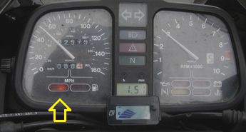 LCD Fuel Gauge: I also installed a backlit LCD fuel gauge. In addition to the fuel gauge it also has an LCD "WARNING" to hook up to the oil pressure switch. Since the K bike already has a warning for that I wired it up be a visual reminder of when the altitude switch is on.