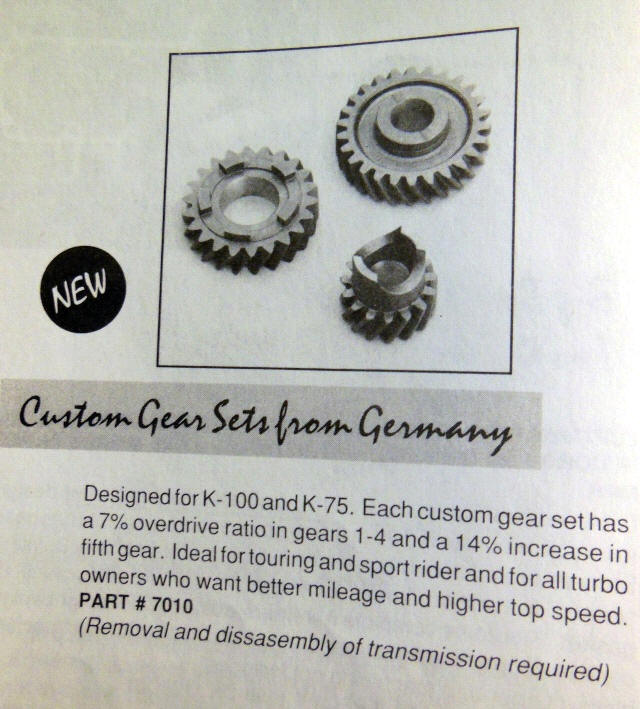 K1100 Transmission & Paralever Final Drive: In order to provide better rear end handling, eliminate the monolever "jacking effect," and not have to worry about drive shaft wear, I installed a K1100 transmission and paralever final drive. The "shortest" (most torque) stock gearing available for the early K bike paralever is 32/11 from an early K1100LT and I had one on hand so that's what I installed. The 32/11 paralever final drive gearing is about 9.1% "taller" than the original 32/10 monolever that most K75s came with. And the K1100 fifth gear is about 3.6% taller than that of a stock K75 transmission. Clutch Arm: I removed the clutch arm and relubed the needle bearings for its pivot arm. Center Stand: The center stand was in good shape (and had obviously been replaced relatively recently) so I used the one that came with the bike.