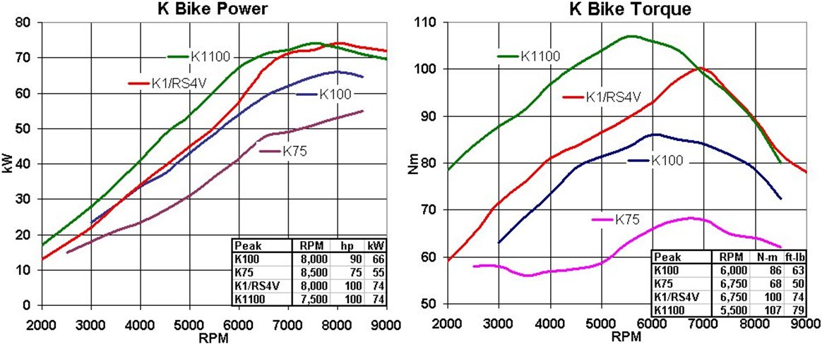 Original BMW Power/Torque Curves: Model | Click thumbnail | K75 |  | K100 |  | K1 & K100RS4V |  | K1100 |  |