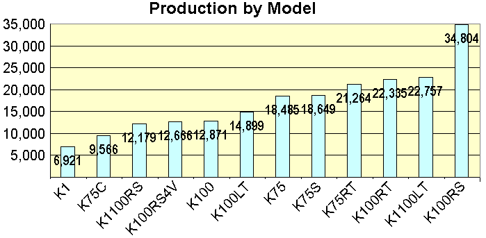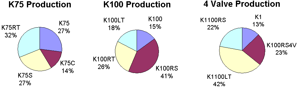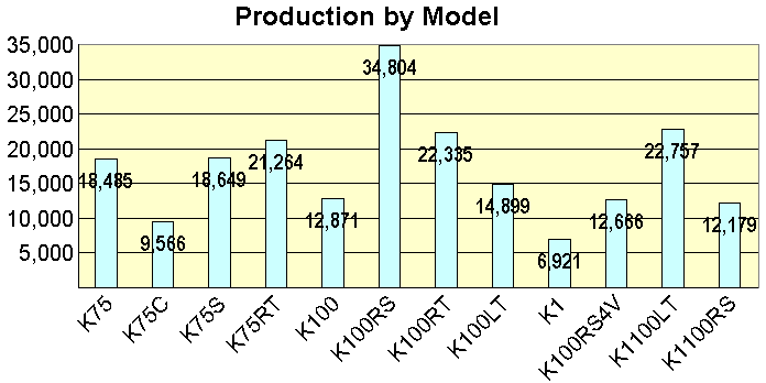 Original factory specifications: <- Click on thumbnail Production Volumes Production | Series | Model 1 | Model 2 | Model 3 | | | | K75 | K569 | 0562 | 0571 | | 18,485 | | | K75C | K569 | 0564 | 0574 | | 9,566 | | | K75S | K569 | 0563 | 0572 | | 18,649 | | | K75RT | K569 | 0565 | 0573 | | 21,264 | 67,964 | | | | | | | | | | K100 | K589 | 0501 | 0511 | | 12,871 | | | K100RS | K589 | 0502 | 0503 | 0513 | 34,804 | | | K100RT | K589 | 0504 | 0505 | 0514 | 22,335 | | | K100LT | K589 | 0506 | 0516 | | 14,899 | 84,909 | 152,873 | | | | | | | | | K1 | 89V1 | 0525 | 0535 | | 6,921 | | | K100RS4V | 89V1 | 0523 | 0533 | | 12,666 | 19,587 | | K1100LT | 89V2 | 0526 | 0536 | | 22,757 | | | K1100RS | 89V2 | 0522 | 0532 | | 12,179 | 34,936 | 54,523 | | | | | | | | | | | | | | | | 207,396 |